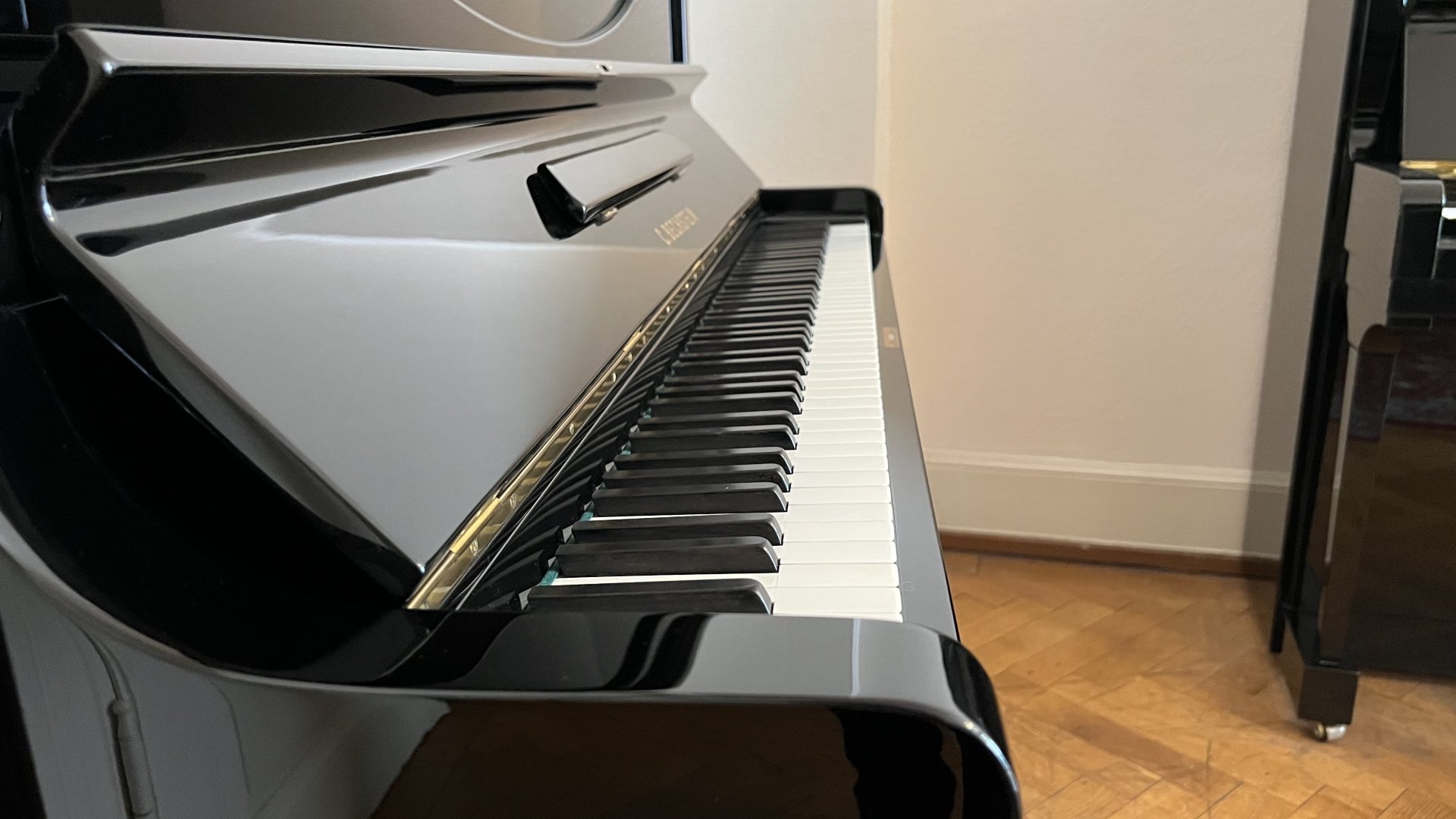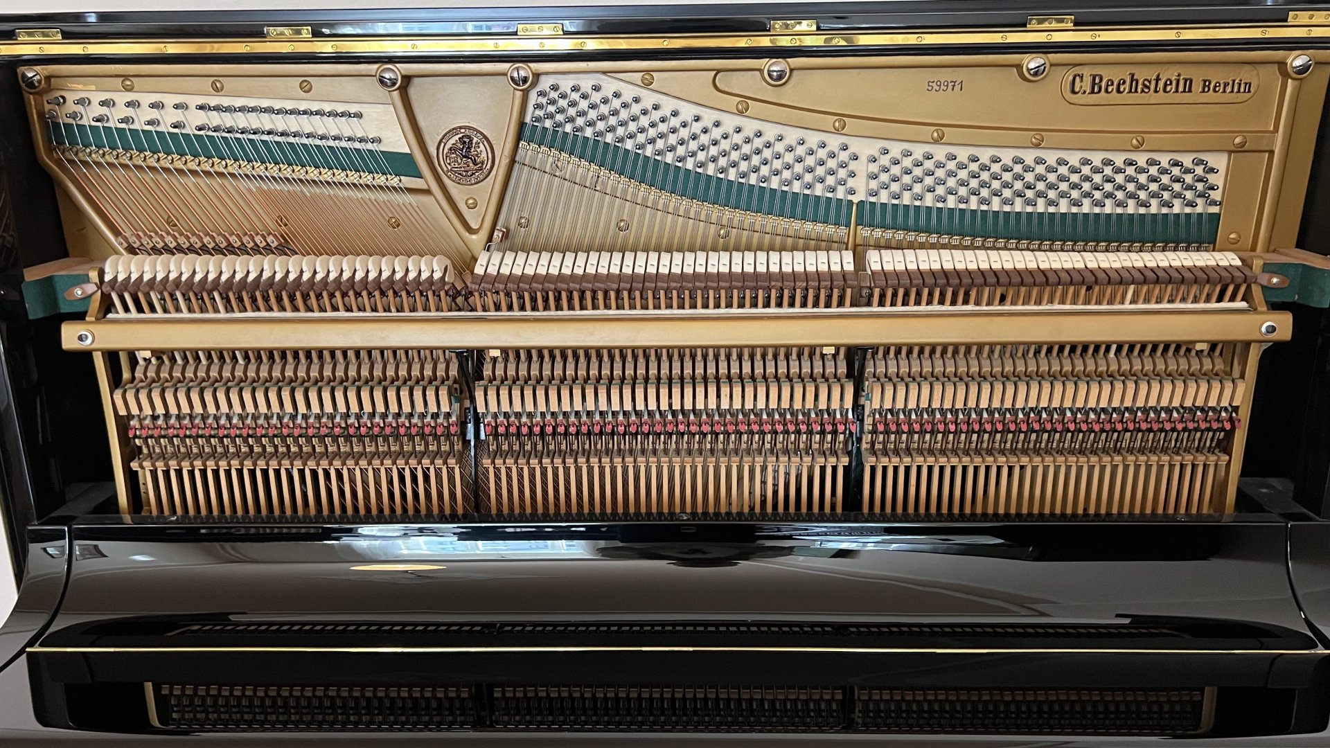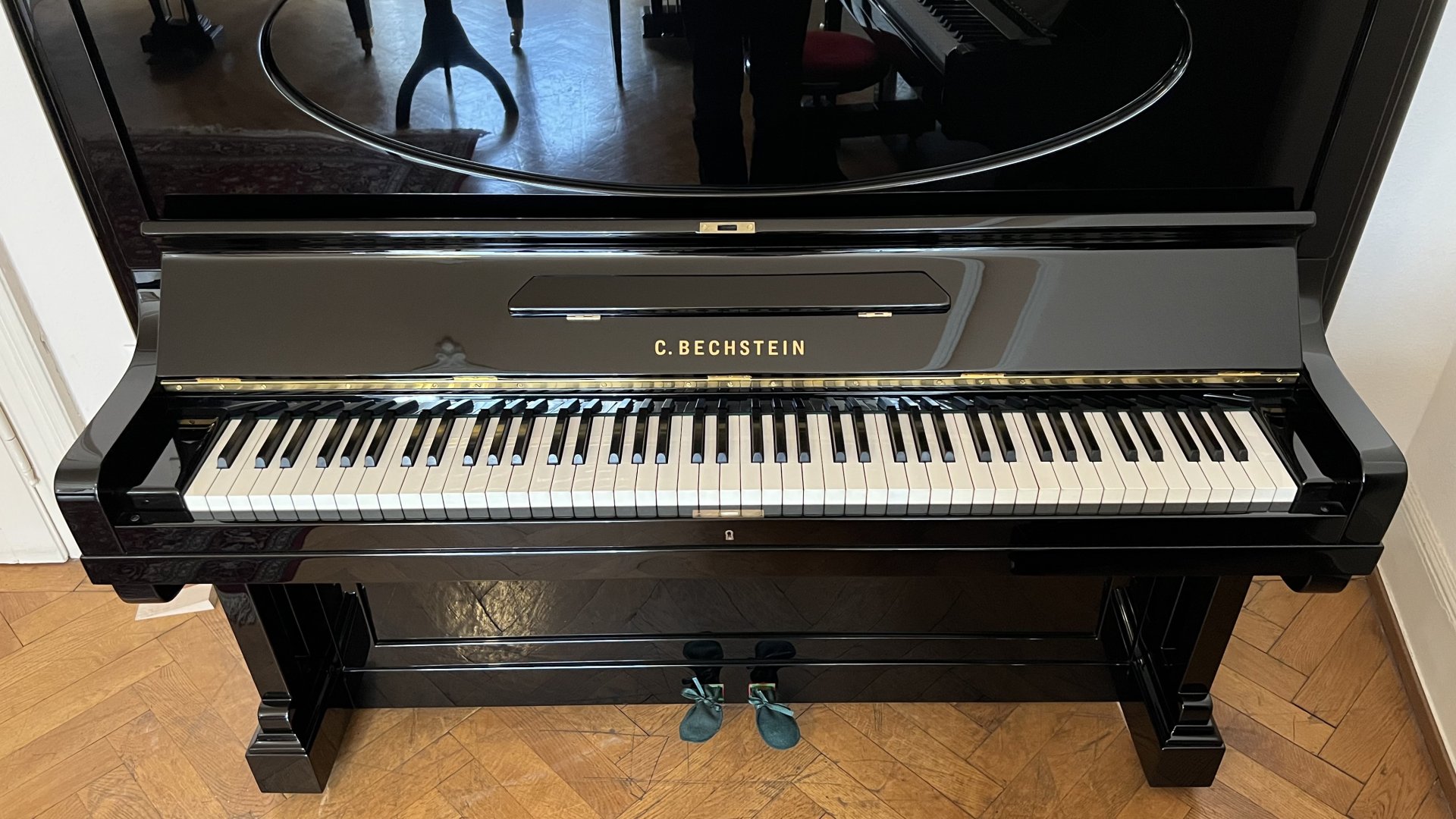 Dieses schöne Bechstein Klavier ist aus dem Jahr 1902 und überzeugt sowohl durch sein perfektes klassisches Gehäuse (Oberfläche neu in Polyester schwarz) als auch durch seinen romantischen Klang. Normalerweise verfügen ältere Klavier über 85 Tasten. Dieses Instrument weist hingegen die Besonderheit von 88 Tasten auf. Der Oberrahmen ist mit einer schlichten Verzierung in Form eines Ovals ausgestattet.
