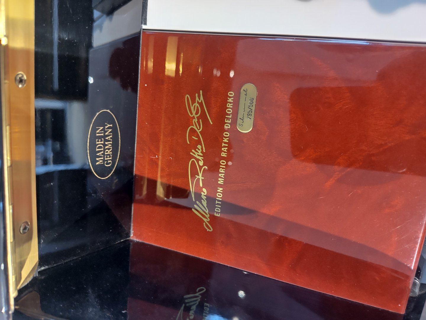 Limitiertes Designermodell von Schimmel! In Zusammenarbeit mit dem Pianisten Mario Ratko Delorko enstand in den 90er Jahren eine limitierte Auflage dieses Modells. Zierelemente aus Bubingaholz runden die Optik des wunderschönen Modells ab. Kleinere Messingappliaktionen unterstreichen die Wertigkeit. Auf der linken Zierbacke ist die Signatur des Pianisten und die Editionsnummer (295/500) zu finden.