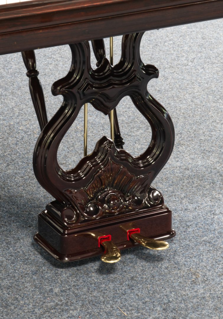 Die Oberfläche des Flügels besteht aus Palisander-Holz und bietet daher eine einzigartig schöne Holzmaserung, da muss man sich einfach verlieben. Leider ist es fotografisch kaum möglich die eigentliche Schönheit darzustellen. Mit der Hochglanz-Shellack-Oberfläche erhält dieses Holz eine einzigartige Tiefe und Lebendigkeit.