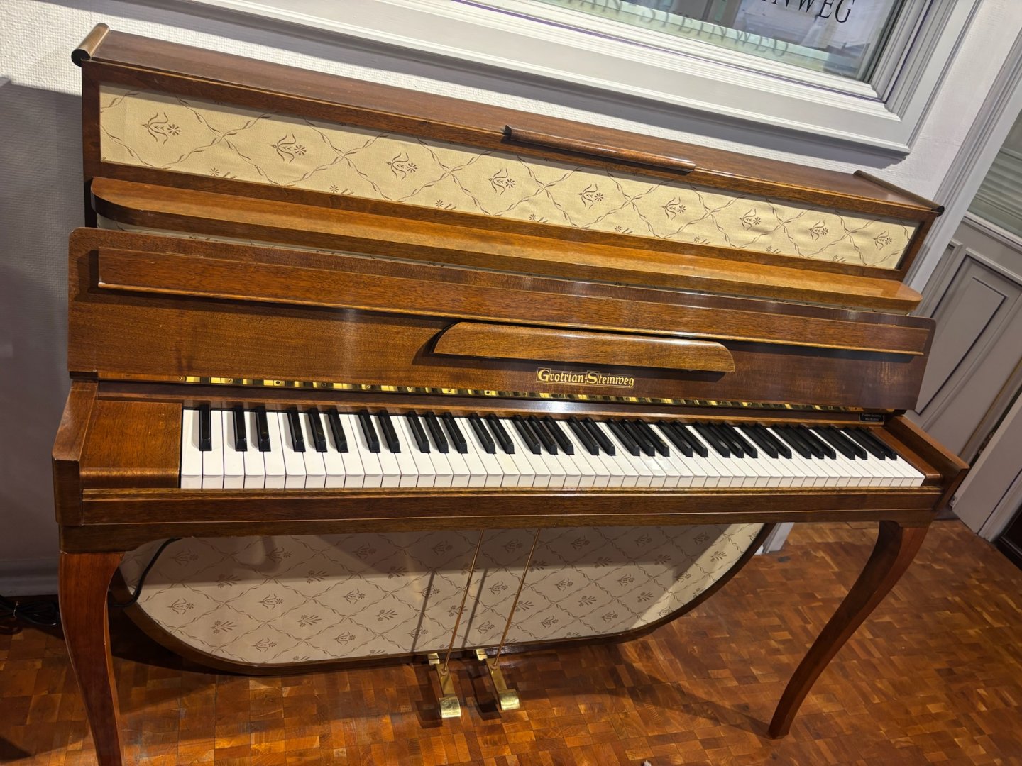 Legendäres Grotrian-Steinweg 110 Stoff. Weniger Gehäuse geht nicht. Sehr schöner offener Klang dank der Stoffbespannung. Auf Basis dieser Raste wird heute das Grotrian-Steinweg 118 gebaut. Überholtes Klavier mit originaler Stoffbespannung mit eingebautem Piano-Life-Saver.